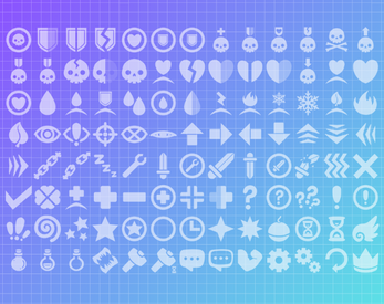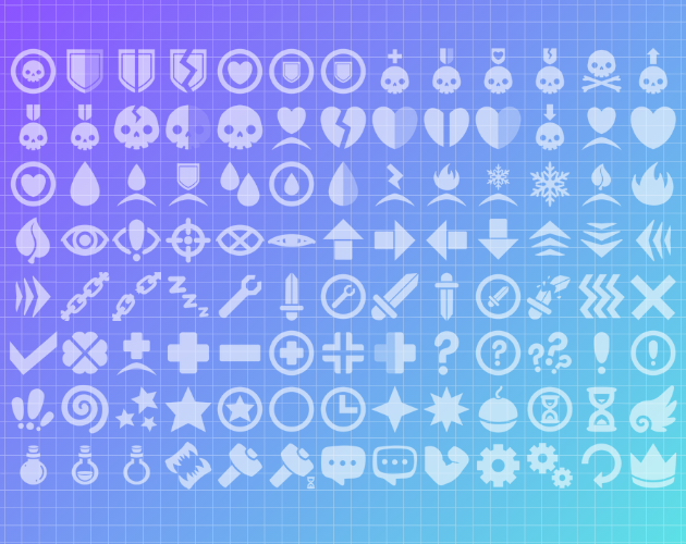 100 flat icons perfectly fitted for status effects. You can find in this package icons fitted for buffs, debuffs, states for a characters or crafting stations.